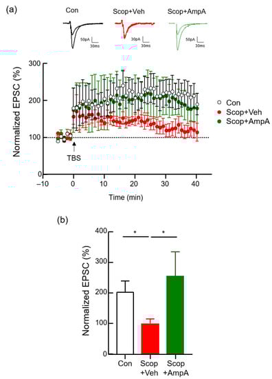 Long-term potentiation (LTP) is a long-lasting increase of postsynaptic responses following electrical stimulation such as theta-burst stimulation (TBS) or a brief, high-frequency stimulation (HFS), leading to an enhancement in the strength of excitatory synaptic transmission and it is considered the generally studied form for examining the synaptic mechanism of learning and memory in the brain [,]. We examined whether the bath application of ampelopsin A to the brain rescues the scopolamine-induced deficit in hippocampal LTP. For the measurement of hippocampal LTP, a single dose of ampelopsin A (10 ng/µL) was applied to the hippocampal slices which were perfused with artificial cerebrospinal fluid (aCSF) containing either DMSO vehicle or scopolamine (100 μM) during the baseline recording and for an additional 20 min after LTP induction. In control mice, TBS (consisting of 3 trains containing 4 pulses 15 bursts) induces a robust increase in the percentage of normalized excitatory postsynaptic current (EPSC) (Figure 2a). Scopolamine treatment markedly decreased the mean of normalized EPSC relative to the control group (Figure 2b, p < 0.05). In the scopolamine and ampelopsin A combined treatment group, the mean of normalized EPSC significantly increased relative to the scopolamine only treatment group (p < 0.05).