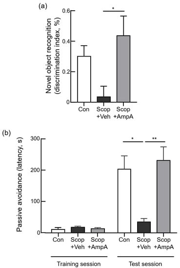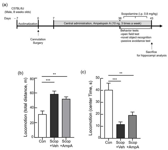 After one week of acclimatization, mice underwent stereotaxic surgery for implantation of a cannula in the brain as previously described []. Using a stereotaxic frame (Kopf Instruments, Tujunga, CA, USA), a 26-gauge guide cannula (Plastics One, Roanoke, VA, USA) was inserted into the third-ventricle (3 V, coordinates: 2.0 mm posterior to the bregma, 5.3 mm below the surface of skull). Following a week recovery period, mice were randomly divided into three groups (n = 5 per group): control (Con, PBS as a vehicle), scopolamine + vehicle (Scop + Veh, PBS as a vehicle), and scopolamine+ampelopsin A (Scop + AmpA) pretreatment group. All groups were administrated three times a week with either 0.5 μL of phosphate-buffered saline (PBS, as a vehicle) or 0.5 μL ampelopsin A (10 ng/µL, dissolved in PBS) for one month. One month later, scopolamine + vehicle (Scop + Veh) and scopolamine + ampelopsin A (Scop + AmpA) pretreatment groups received 0.8 mg/kg scopolamine ((-)-scopolamine hydrobromide trihydrate, dissolved in 0.9% saline, i.p.) and the control group was injected with 0.9% saline (i.p.) before each behavioral test. The experimental schedule of chemical administration and behavioral tests is shown in Figure 3a.