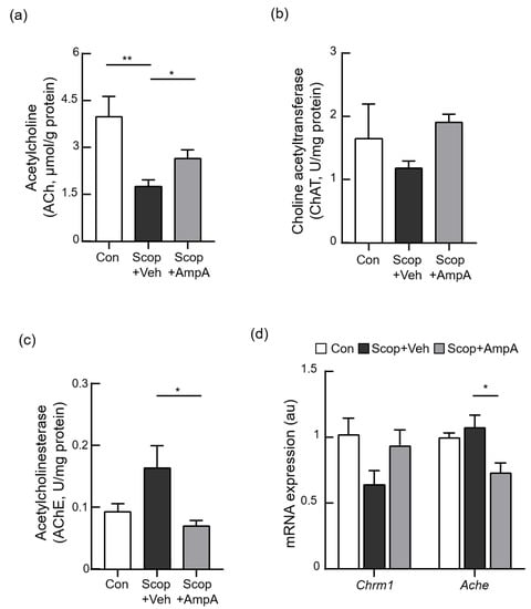 Y.H. co-designed and performed mice surgery, treatments, qPCR, behavioral tests, cholinergic experiments and prepared all figures; Y.-H.C. did LC/MS and NMR, and A.L. conducted data analysis of LC/MS and NMR; Y.-E.H. and S.-J.O. performed electrophysiology and data analysis; R.M. performed preliminary experiments about AmpA’s central treatments; B.L., S.Y.R., C.W.C., and M.S.K. performed all data analysis and wrote the paper; C.W.C. and M.S.K. conceived of the hypothesis and designed the project, and all authors participated in discussions. All authors have read and agreed to the published version of the manuscript.