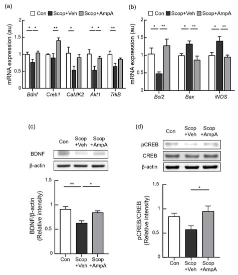 Increase of BDNF-related and anti-apoptotic signaling by central administration of ampelopsin A. Male C57BL/6J mice (10 weeks old) were given 0.5 µL ampelopsin A (10 ng/µL, three times a week) or the same volume of the vehicle (PBS) via the third-ventricle of the brain for one month. Mice were sacrificed and hippocampi were isolated for measurements of mRNA and protein expression. 30 min before the mice sacrifice, scopolamine (0.8 mg/kg, i.p.) was administered to each group; Scop + Veh (pre-treatment of PBS as a vehicle, scopolamine injection on the experimental day) and Scop + AmpA (pre-treatment of ampelopsin A, scopolamine injection on the experimental day) groups. The control group (Con) was pre-treated with the vehicle into 3 V then was injected PBS (i.p.) instead of scopolamine on the experimental day. (a) Alterations in the expression of Bdnf, Creb1, CaMK2, Akt, and Trkb were determined by real time-PCR (n = 4). (b) Bcl2, Bax, and iNOS mRNA levels determined by real time-PCR (n = 4–5). Gene expression was normalized to that of β-actin. Au means the arbitrary units. (c) Quantification of BDNF/β-actin and (d) phosphorylated CREB/CREB intensity (n = 4). Values are expressed as means ± SEM. * p < 0.05, ** p < 0.01; one-way ANOVA with Dunnett’s multiple comparisons test.