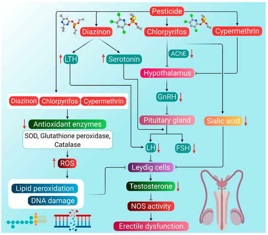 Probable mechanism of association of pesticide-induced ROS with hypogonadism and ED. Diazinon enhances LTH levels, which in turn lowers the activity of LH. Diazinon also stimulates producing serotonin that inhibits the action of both LH and FSH, thereby decreasing testosterone levels. Chlorpyrifos can reduce the activity of AChE in the hypothalamus. Consequently, the entire HPG axis is disrupted, leading to reduced testosterone production. Chlorpyrifos also reduces the concentration of sialic acid, which then inhibits Leydig cells. Cypermethrin disrupts the HPG axis by inhibiting the activity of the hypothalamus. Organophosphorus pesticides diazinon and chlorpyrifos, as well as pyrethroid pesticide cypermethrin, cause a decline in the antioxidant enzyme activity, thereby enhancing ROS generation. ROS causes lipid peroxidation and DNA damage, which inhibits the activity of Leydig cells, followed by reduced testosterone synthesis. Reduction in testosterone levels brings about the inactivity of the NOS enzyme, which ultimately leads to ED. Red arrows represent the increase and decrease of the respective substances, which have a negative impact on testosterone production, leading to hypogonadism and ED. (LTH: luteotropic hormone, AChE: acetylcholinesterase, GnRH: gonadotropin-releasing hormone, LH: luteinizing hormone, FSH: follicle-stimulating hormone, SOD: superoxide dismutase, NOS: nitric oxide synthase, ED: erectile dysfunction, ROS: reactive oxygen species).