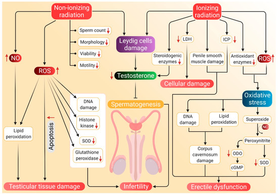 Probable mechanism of association of radiation-induced ROS with hypogonadism and ED. Nonionizing radiations damage the Leydig cells, which reduces testosterone synthesis and subsequent inhibition of spermatozoa. Such radiations negatively affect sperm parameters, including count, motility, morphology, viability and motility. Nonionizing radiations also stimulate NO activity, which along with ROS, brings about lipid peroxidation and damage to testicular tissues. These tissues are also damaged by apoptosis mediated by elevated ROS levels. Nonionizing radiation-induced ROS further causes DNA damage and decreases the concentration of histone kinase along with a reduction of SOD and glutathione peroxidase activity. Whereas ionizing radiations cause a decline in testosterone production by damaging Leydig cells and by inhibiting the activity of steroidogenic enzymes. Such radiations enhance LDH activity, which results in cellular damage. Damage to the penile smooth muscles and reduced ICP may cause ED. ED is also caused by decreased cGMP levels and damage to the corpus cavernosum, which are brought about by ionizing radiation-induced oxidative stress. Red arrows represent the increase and decrease of the respective substances and sperm parameters beyond harmful levels. (NO: nitric oxide, SOD: superoxide dismutase, LDH: lactate dehydrogenase, ICP: intracavernosal pressure, ODO: oxadiazoloquinoxalin-1-one, cGMP: cyclic guanosine monophosphate, ED: erectile dysfunction, ROS: reactive oxygen species).