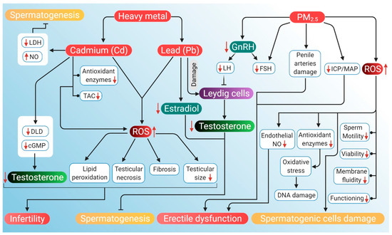 Probable mechanism of association of ROS induced by air pollutants (heavy metals Cd and Pb, and PM2.5) with hypogonadism and ED. Heavy air pollutant Cd increases NO and decreases LDH activity to inhibit spermatogenesis. It also lowers DLD and cAMP levels, which reduces testosterone. Cd decreases antioxidant enzymes along with a decrease in total antioxidant capacity. Through these mechanisms, Cd increases ROS production, which in turn causes lipid peroxidation, testicular necrosis, fibrosis and reduced testicular size. These factors, together with lowered levels of testosterone, contribute to the cause of infertility. Another heavy metal Pb reduces testosterone levels and estradiol, which leads to the inhibition of spermatogenesis. PM2.5 downregulates GnRH activity, thereby declining LH and FSH levels. Reduction in LH inhibits the action of Leydig cells, thereby lowering testosterone production. PM2.5 also induces ED by damaging penile arteries, reducing the ICP/MAP ratio and inhibiting endothelial NO activity. PM2.5 further stimulates the generation of ROS that can damage DNA and spermatogenic cells. PM2.5-induced ROS may also have a negative impact on sperm quality, particularly motility, viability, functioning and membrane fluidity. Red arrows represent the increase and decrease of the respective substances and sperm parameters beyond harmful levels. (NO: nitric oxide, LDH: lactate dehydrogenase, DLD: dihydrolipoamide dehydrogenase, cAMP: cyclic adenosine monophosphate, TAC: total antioxidant capacity, GnRH: gonadotropin-releasing hormone, LH: luteinizing hormone, FSH: follicle-stimulating hormone, ICP: intracavernosal pressure, MAP: mean arterial pressure, ED: erectile dysfunction ROS: reactive oxygen species).