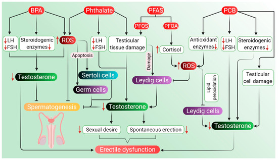 Probable mechanism of association of ROS induced by BPA, phthalates, PFAS and PCB with hypogonadism and ED. BPA downregulates the production of LH, FSH and steroidogenic enzymes along with upregulation of ROS, which, in turn, causes a decline in testosterone levels followed by inhibition of spermatogenesis. BPA-mediated ROS generation may also suppress testosterone activity and spermatogenic processes directly. Phthalates cause damage to testicular tissues and lower the levels of LH and FSH, which further reduces testosterone levels. ROS generation by phthalates may bring about the apoptosis of Sertoli cells and germ cells, ultimately inhibiting spermatogenesis. Lowered testosterone levels also result in diminished sexual desire and reduce spontaneous erection, which may lead to ED. PFAS, such as PFOS and PFOA, may also cause damage to Leydig cells leading to reduced testosterone levels. PFOS and PFOA may induce cortisol production, which leads to ROS generation, ultimately resulting in suppression of the hormonal activity of Leydig cells. PCBs damage testicular tissues and lower the activity of LH and FSH together with reducing the steroidogenic enzymes, which may lead to lowered testosterone levels. PCBs can also reduce the levels of antioxidant enzymes, and resulting in oxidative stress induces lipid peroxidation in Leydig cells, thus lowering the level of testosterone. PCB-induced reduction of testosterone may also give rise to ED. Red arrows represent the increase and decrease of the respective substances, which negatively impact testosterone level, thereby inhibiting spermatogenesis and causing hypogonadism and ED. (BPA: bisphenol A, PFAS: perfluoroalkyl substances, PFOS: perfluorooctanesulfonic acid, PFOA: perfluorooctanoic acid, PCB: polychlorinated biphenyls, LH: luteinizing hormone, FSH: follicle-stimulating hormone, ED: erectile dysfunction, ROS: reactive oxygen species).