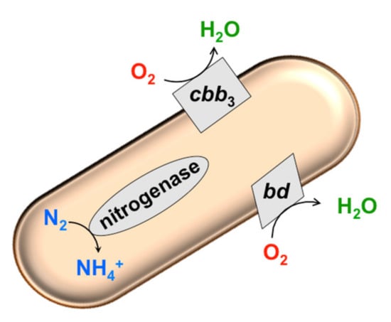 - Kelly, M.J.S.; Poole, R.K.; Yates, M.G.; Kennedy, C. Cloning and mutagenesis of genes encoding the cytochrome bd terminal oxidase complex in Azotobacter vinelandii: Mutants deficient in the cytochrome d complex are unable to fix nitrogen in air. J. Bacteriol. 1990, 172, 6010–6019. [Google Scholar] [CrossRef] [PubMed]