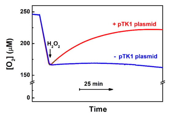 Catalase-like activity of catalase-deficient E. coli UM2 cells overexpressing cytochrome bd-I. Shown is the change in O2 concentration after the addition of 0.235 mM H2O2 to respiring cells in which the enzyme is either overexpressed (+pTK1 plasmid that carries the cydAB operon) or not (−pTK1 plasmid). Adapted from [].