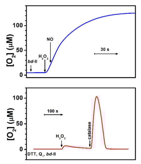 Preparations of untagged cytochrome bd-II isolated from E. coli also show high catalase-like activity. Similar to cytochrome bd-I, NO at a high concentration (20 µM) does not affect the activity (Figure 5, top panel). The observed О2 evolution is also susceptible to the bd-II enzyme redox-state. When cytochrome bd-II is converted into the fully reduced state following the consumption of all O2 in turnover with excess DTT and Q1, the H2O2-induced catalase-like activity is no longer observed. However, if a bona fide catalase is subsequently added, the reaction proceeds (Figure 5, bottom panel). Further studies will show how this discovered activity of cytochrome bd-II (Figure 4) contributes to the bacterial defense mechanisms against oxidative stress in vivo. In this regard, a very recent report by Chanin et al. [] on the role of cytochrome bd-II-mediated aerobic respiration of E. coli during intestinal inflammation deserves attention. In the course of the inflammatory process, the host produces antimicrobial products including O2•− to impede bacterial growth. The O2•− molecules generated by the Nox1 NADPH oxidase undergo rapid dismutation to H2O2 and O2 by superoxide dismutase. Using chemical and genetic murine models of noninfectious colitis, Chanin et al. showed that cytochrome bd-II provides a fitness advantage for E. coli during anaerobic growth in the presence of H2O2 in the inflamed murine intestine. In the absence of Nox1, this fitness advantage is ablated. To do this, the bd-II enzyme may use H2O2 or its breakdown product O2 generated by the catalases KatE and KatG, as the substrate. It turned out that in the absence of KatE and KatG, at 5 µM H2O2, the wild-type strain outcompetes the mutant strain devoid of cytochrome bd-II. For this reason, Chanin et al. concluded that O2 produced by catalase-mediated degradation of H2O2 serves as the terminal electron acceptor for the bd-II oxidase []. However, given the observed catalase-like activity of cytochrome bd-II (Figure 5, top panel), the possibility that at higher H2O2 concentrations, cytochrome bd-II could also metabolize H2O2 in vivo, contributing to the O2 pool formation in the inflamed gut, cannot be excluded. Whatever the exact mechanism is, detoxification of the host-derived ROS through cytochrome bd-II allows E. coli to respire in an otherwise anaerobic environment, promoting bacterial outgrowth [].