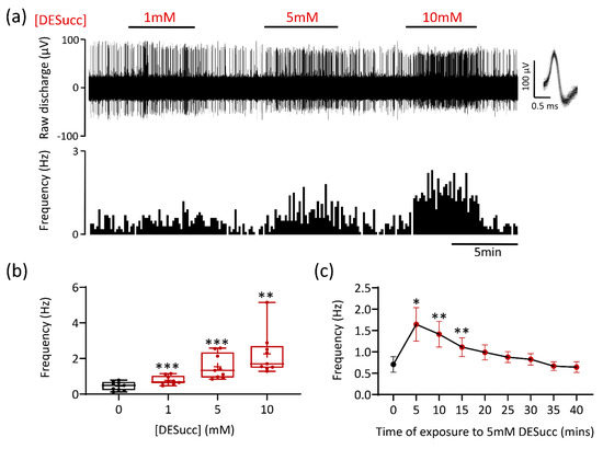 Succinate causes carotid body (CB) chemoafferent stimulation. (a) Example CB chemoafferent recording of the response to 1, 5, and 10 mM diethyl succinate (DESucc). Raw voltage is shown (upper) along with frequency histograms (lower). Overdrawn action potentials are inset, demonstrating single fibre discrimination. (b) Mean steady-state responses to DESucc at 1, 5, and 10 mM concentrations (n = 9 fibres, N = 4 animals). Data presented as box-whisker plots with median, mean (shown as +), the box representing the interquartile range and the whiskers extending to outliers. Single points represent individual fibres. ** and *** denote p < 0.01 and p < 0.001 vs. 0 mM, one-way repeated measures ANOVA with Dunnett’s post hoc test. (c) Time course of prolonged exposure to 5 mM DESucc (n = 11 fibres, N = 5 animals). Data presented as mean ± SEM. * and ** denote p < 0.05 and p < 0.01 vs. 0 min, one-way repeated measures ANOVA with Dunnett’s post hoc test.