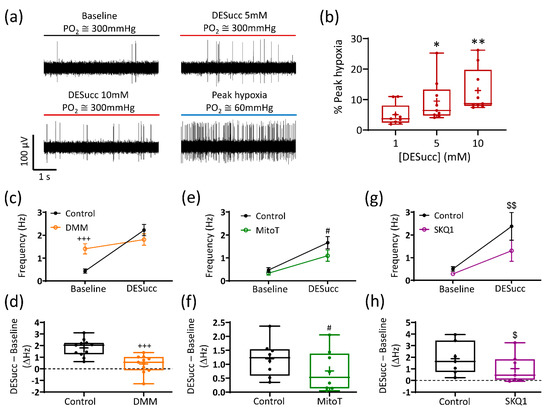 The carotid body (CB) response to succinate is dependent on mitochondrial complex II activity and reactive oxygen species generation. (a) Example 5 s raw CB chemoafferent recordings from the same fibre comparing activity in the presence of diethyl succinate (DESucc—5 and 10 mM) with peak hypoxia. (b) Mean responses to 1, 5, and 10 mM DESucc as a percentage of peak hypoxia (n = 9 fibres, N = 4 animals). * and ** denote p < 0.05 and p < 0.01 vs. 1 mM, one-way repeated measures ANOVA with Dunnett’s post hoc test. (c,d) Absolute and changes in frequency caused by 5 mM DESucc ± 10 mM dimethyl malonate (DMM), respectively (n = 11 fibres, N = 5 animals). (e,f) Absolute and changes in frequency caused by 5 mM DESucc ± 20 µM MitoTEMPO (MitoT), respectively (n = 8 fibres, N = 6 animals). (g,h) Absolute and changes in frequency caused by 5 mM DESucc ± 1 µM SKQ1, respectively (n = 6 fibres, N = 5 animals). For (c,e,g), data presented as mean ± SEM. +++ p < 0.001 control vs. DMM, # p < 0.05 control vs. MitoT, $$ p < 0.01 control vs. SKQ1, two-way ANOVA with Tukey post hoc test. For (d,f,h), data presented as box-whisker plots with median, mean (shown as +), the box representing the interquartile range and the whiskers extending to outliers. Single points represent individual fibres. +++ p < 0.001 control vs. DMM, # p < 0.05 control vs. MitoT, $ p < 0.05 control vs. SKQ1, paired t-test.
