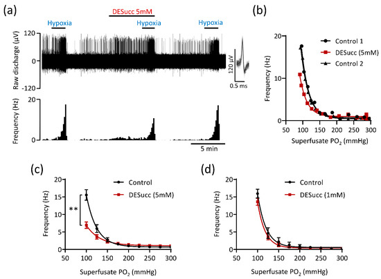 CB chemoafferent activity recorded during hypoxia exhibited a characteristic exponential increase below a certain PO2 threshold (Figure 3a,b). In the presence of 5 mM DESucc, chemoafferent frequency in hypoxia was significantly decreased and the PO2 ‘set-point’ for hypoxic response initiation was left-shifted, suggestive of an attenuation of O2 sensitivity (Figure 3a–c). The inhibition of the hypoxic response caused by DESucc was reversible (Figure 3a,b). Application of a lower concentration of DESucc (1 mM) did not alter the CB chemoafferent response to hypoxia (Figure 3d).