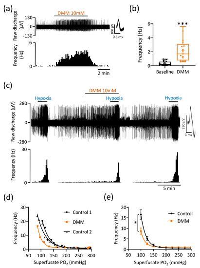 In the current investigation, DMM inhibition of mitochondrial complex II resulted in a pronounced chemoafferent excitation. We speculate that basal stimulation by DMM was a consequence of a slight fall in intracellular MgATP, but this requires validation in future work. Accordingly, previous studies identified persistent type I cell membrane depolarisation in mice lacking one SDHD allele (SDHD+/−) [23]. These findings highlight a particularly high importance of succinate metabolism in maintaining normoxic electrical stability within the CB. Mutations in the SDHD gene are one of the causes of pheochromocytoma and paraganglioma, paragangliomas being the most prevalent type of CB cancer [58]. Whether or not the chronic stimulation itself contributes to oncogenesis (in addition to succinate dependent HIF1α stabilisation) is an area that has not yet been fully explored, particularly in combination with ageing.