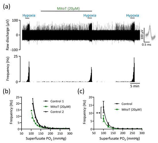 The mitochondrial antioxidant MitoTEMPO (MitoT) decreases but does not abolish carotid body (CB) chemoafferent responses to hypoxia. (a) Raw CB chemoafferent recording of the response to hypoxia ± 20 μM MitoT. Raw voltage is shown (upper) along with frequency histograms (lower). Inset: overdrawn action potentials from a single fibre. (b) PO2-chemoafferent frequency response curves from a single experiment corresponding to the example shown in (a). (c) Mean chemoafferent hypoxic response curves for paired control and 20 μM MitoT (n = 9 fibres, N = 6 animals). Data are presented as mean ± SEM. ** denotes p < 0.01 MitoT vs. control, two-way repeated measures ANOVA.