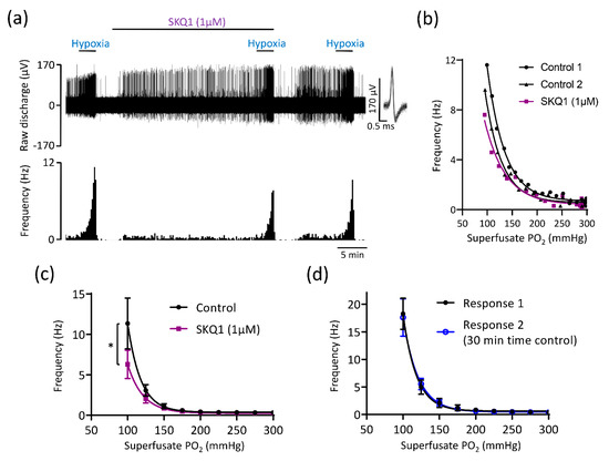 The mitochondrial antioxidant SKQ1 partially attenuates carotid body (CB) chemoafferent responses to hypoxia. (a) Raw CB chemoafferent recording of the response to hypoxia ± 1 μM SKQ1. Raw voltage is shown (upper) along with frequency histograms (lower). Inset: overdrawn action potentials from a single fibre. (b) PO2-chemoafferent frequency response curves from a single experiment corresponding to the example shown in (a). (c) Mean chemoafferent hypoxic response curves for paired control and 1 μM SKQ1 (n = 9 fibres, N = 6 animals). (d) Mean chemoafferent hypoxic response curves for 2 repeated control hypoxic exposures separated by 30 min (n = 7 fibres, N = 7 animals). For (c,d), data are presented as mean ± SEM. * denotes p < 0.05 SKQ1 vs. control, two-way repeated measures ANOVA.