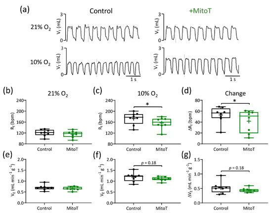 MitoTEMPO (MitoT) decreases the rise in respiratory frequency (Rf) during hypoxia. (a) Representative respiratory traces (tidal volume (VT) vs. time, 5 s) illustrating breathing pattern before (left) and after (right) MitoT administration (19.6 µM kg−1, I.P.), in normoxia (21% O2) and during hypoxia (10% O2). (b–d) Mean Rf in normoxia, hypoxia and the relative change, respectively, before and after MitoT (N = 8 animals). (e–g) Mean minute ventilation (VE) in normoxia, hypoxia and the relative change, before and after MitoT. Data presented in box and whisker plots show mean (+), median line with a box range of 25th and 75th percentiles and outlier whiskers at minimum and maximum. Single points represent individual animals. * denotes p < 0.05, paired t-test.