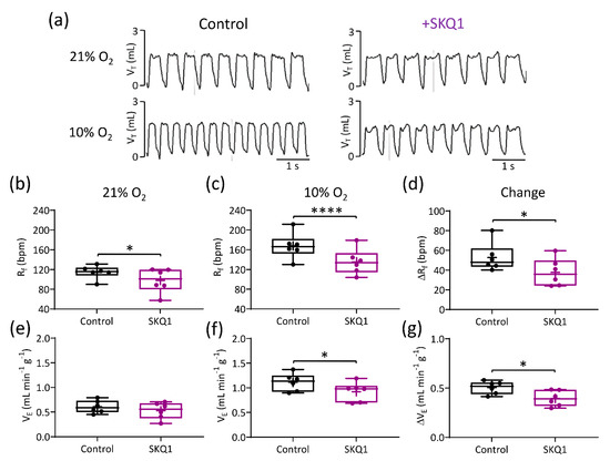 The mitochondrial antioxidant SKQ1 decreases the hypoxic ventilatory response (HVR). (a) Representative respiratory traces (tidal volume (VT) vs. time, 5 s) illustrating breathing pattern before (left) and after (right) SKQ1 administration (500 nM kg−1, I.P.), in normoxia (21% O2) and during hypoxia (10% O2). (b–d) Mean Rf in normoxia, hypoxia, and the relative change, respectively, before and after SKQ1 (N = 6 animals). (e–g) Mean minute ventilation (VE) in normoxia, hypoxia, and the relative change (HVR), before and after SKQ1. Data presented in box and whisker plots show mean (+), median line with a box range of 25th and 75th percentiles and outlier whiskers at minimum and maximum. Single points represent individual animals. * and **** denote p < 0.05 and p < 0.001 control vs. SKQ1 respectively, paired t-test.