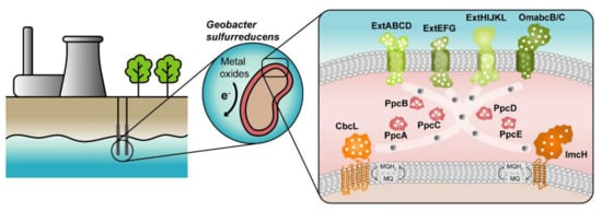 - Aklujkar, M.; Coppi, M.V.; Leang, C.; Kim, B.C.; Chavan, M.A.; Perpetua, L.A.; Giloteaux, L.; Liu, A.; Holmes, D.E. Proteins involved in electron transfer to Fe(III) and Mn(IV) oxides by Geobacter sulfurreducens and Geobacter uraniireducens. Microbiology 2013, 159, 515–535. [Google Scholar] [CrossRef]