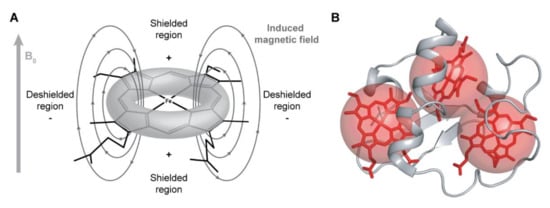 The NMR signals of the heme substituents are highly dependent on the ring-current and paramagnetic effects caused by the heme groups. The heme ring-current effects are caused by the circular movement of electrons around the pyrrole rings, which create local magnetic fields responsible for the typical positions observed for these signals [82]. Nuclei sensing a local magnetic field with less intensity than the applied magnetic field B0 (shielded regions represented in Figure 4A) are displaced to lower chemical shift values in the NMR spectrum, whereas nuclei sensing a local magnetic field with higher intensity than B0 (deshielded regions represented in Figure 4A) will be displaced to higher chemical shift values.