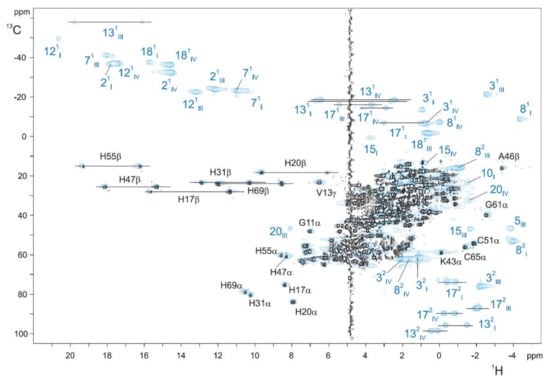2D 1H,13C-HSQC NMR spectra of unlabeled (blue contours) and 13C labeled (black contours) PpcA obtained at 25 °C, with 640 and 80 scans, respectively. To not overcrowd the figure, only the resonances separated from the main signal envelope are indicated. Blue and black labels indicate the heme substituents and the polypeptide resonances, respectively. The peaks of the protons connected to the same carbon atom (CH2 groups) are linked by a straight line. In triheme cytochromes c7, the hemes are numbered I, III and IV [87]. This figure was reproduced with the permission of Elsevier from the original work [72].