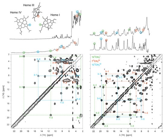 In the reduced state, the first step of the assignment is the analysis of a 2D 1H-TOCSY NMR spectrum. In this experiment, scalar couplings (through bond nuclear interactions) within a spin system are observable [84], allowing the identification of the connectivities between the thioether methines (31H or 81H) and the thioether methyl groups (32CH3 and 82CH3). 2D 1H-NOESY NMR experiments allow the detection of spatial correlation between nuclei that are typically closer than 5 Å [84]. Meso protons have several short-range intraheme connectivities with other heme substituents (Figure 5), thus possessing distinctive patterns. Protons 20H connect with two heme methyls (21CH3 and 181CH3), and their identification is straightforward. Protons 5H and 10H have connectivities with a methyl group (71CH3 or 121CH3, respectively), a thioether methyl (32CH3 or 82CH3, respectively) and a thioether methine (31H or 81H, respectively). Consequently, their discrimination can only be achieved by observing the connectivities between the heme methyl 21CH3 with the closest thioether groups (31H or 32CH3), which are unequivocally assigned in the 2D 1H-TOCSY spectrum. This allows the connection between the 20H and 5H edges of each heme. The heme methyls 71CH3, part of the 5H edges of the hemes, show connectivities with thioether groups (81H and 82CH3), which are in 10H edges. After the identification of these three heme edges, 15H protons can be identified by observing the connectivities between cross-peaks that connect 15H and 121CH3 or 181CH3 protons. This strategy of assignment was applied to MCs by Turner and co-workers [85], based on the original work performed on the monoheme horse heart cytochrome c [86]. In the case of MCs, structural data provide information on the expected interheme NOE connectivities, which can be explored to discriminate the different heme edges and unequivocally assign the heme substituents.