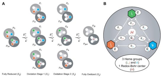 The redox-Bohr effect tunes the heme redox potential values by changes in the protonation state of the redox-Bohr center in the vicinity of the hemes [90]. Its magnitude is determined by redox-Bohr interactions (giH). Considering pure electrostatics, negative redox-Bohr interaction values indicate that deprotonation of the redox-Bohr center (removal of a positive charge) stabilizes the oxidized state (lower reduction potential values) and vice-versa. The addition of a redox-Bohr center into the thermodynamic model of an MC further complicates the redox network of the protein (Figure 8B). Furthermore, due to the close proximity of the heme groups in MCs, their redox potentials are mutually affected by the oxidation state of their neighbors (redox interactions, gij). Considering pure electrostatics, the positive redox interaction values between the heme groups indicate that the oxidation of one heme hinders the oxidation of its neighbor. Therefore, with the progressive oxidation of an MC, the hemes’ redox potentials increase, and their reduced form is stabilized. The magnitude of the redox and redox-Bohr interactions correlates to the spatial distance between the interacting centers.