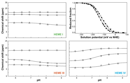 The NMR data obtained with redox titrations only defines the relative heme reduction potentials, redox and redox-Bohr interactions. Therefore, to determine the absolute potentials, the total reduced protein fractions (Equation (14)) need to be measured through redox titrations followed by UV-visible spectroscopy, as described in Section 2.1. The data obtained from both redox titrations are fitted to the presented thermodynamic model using the Marquardt method [91].