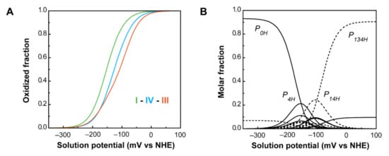 The total reduced fraction can be represented as a function of the solution potential for each pH value, by accounting the relative populations weighted by the number of reduced hemes (Equation (14)):