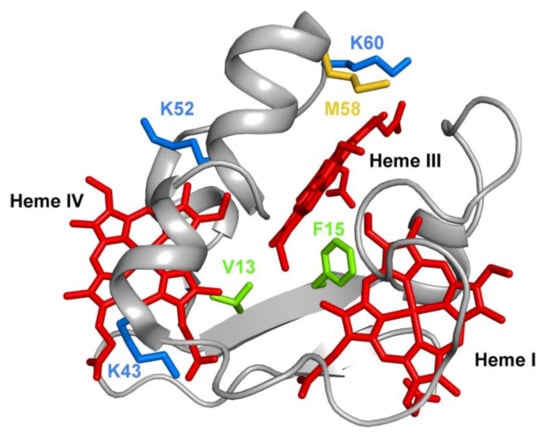 The spatial location of the residues mutated in the PpcA solution structure. The PpcA polypeptide chain (PDB code: 2MZ9 [56]) is shown as a Cα ribbon in gray, with the heme groups in red. The side chains of V13 and F15 are represented in green; K43, K52 and K60 in blue; and M58 in yellow, all in stick drawings.