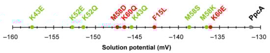 The redox properties of the heme groups of MCs can be modulated considering different structural aspects, including intrinsic properties of the heme cofactors and those of the neighbor residues. Mutations can be designed to explore different chemical properties, including the heme’s solvent exposure and network of interactions, such as surrounding hydrogen bonds and ionizable residues. Therefore, depending on the location and nature of the targeted residue, different strategies can be applied. In this section, a summary of the different properties that have been explored to design PpcA mutants by site-directed mutagenesis is presented, together with a discussion regarding their impact on the protein’s functional behavior.