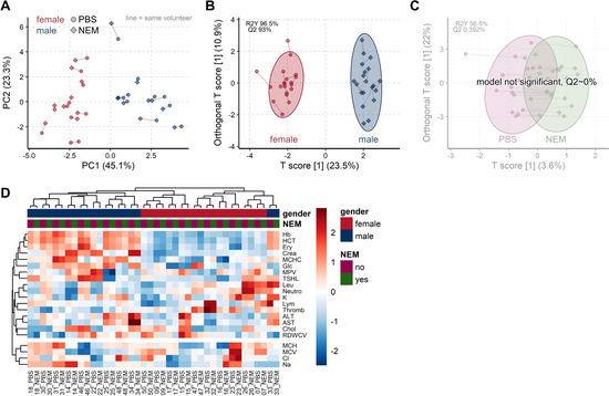 Addition of NEM to the blood tubes does not influence common clinical blood parameters. (A) The unsupervised PCA scores plot shows the very high similarity of all 21 clinical parameters for each of the 20 volunteers (connected by the gray line) when measured from tubes spiked with PBS (circles) or with NEM (diamonds). Samples are colored according to gender (female red, male blue), showing the expected strong group separation. (B) OPLS-DA scores plot reconfirm the PCA findings that clinical parameters significantly differ between gender, while (C) the addition of NEM to PBS has no significant impact ((A,C) values in Supplementary Materials, Data 1). (D) Heatmaps with hierarchical clustering show the similarity of obtained values between tubes with PBS or NEM, always clustering both samples from the same volunteer together.