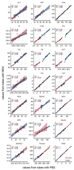 In addition, we performed a direct comparison by linear correlation. Values from NEM and PBS tubes correlated, in general, very well with each other for both genders (Figure 3). As expected, males had, in general, much higher red blood cell–related values (Ery, Hb, HCT, MCHC, MCV) and higher creatinine (crea) as a result of their higher muscle mass.