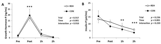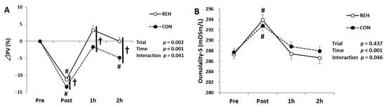 There was no difference in the exercise duration to exhaustion in either trial (REH: 26.8 ± 2.0, CON: 27.2 ± 2.0 min, p = 0.1) [23]. To investigate the effects of beverage intake on dehydration, we measured the percentage change of plasma volume (ΔPV) and serum osmolality. In CON, ΔPV decreased immediately after exercise in both trials (Figure 1A) [23]. In CON, ΔPV remained lower at the end of the trial, whereas REH did not change (Figure 1A) [23]. Serum osmolality increased immediately after exercise and showed different changes between trials (interaction; p = 0.046). However, no significant difference was observed between trials at either time point (Figure 1B). These results indicate that beverage intake after exercise restored exercise-induced dehydration.