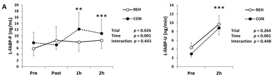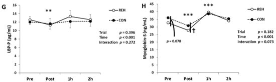 To evaluate muscle damage, we measured serum myoglobin concentration. Myoglobin decreased immediately after exercise and increased 1 h after exercise, and the myoglobin changes trended to differ between trials (interaction; p = 0.073, Figure 2H). Immediately after exercise, serum myoglobin concentration in CON was higher than that in REH. Pre exercise, serum myoglobin concentration in CON had a higher trend than that in REH (Figure 2H). These results indicate that beverage intake did not influence exercise-induced renal, intestinal and muscle damage, and this exercise mode did not induce endotoxemia.