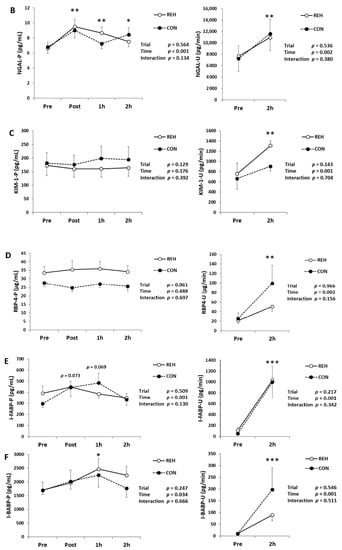 Changes in plasma and urinary (A) L-FABP, (B) NGAL, (C) KIM-1, (D) RBP-4, (E) I-FABP, (F) I-BABP, (G) LBP and (H) myoglobin. Values are presented as mean ± SE. * p < 0.05, ** p < 0.01, *** p < 0.001 vs. Pre. † p < 0.05 REH vs. CON in each time point. L-FABP, liver-fatty acid binding protein; NGAL, neutrophil gelatinase-associated lipocalin; KIM-1, kidney injury molecule 1; RBP-4, retinol binding protein 4; I-FABP, intestine-fatty acid binding protein; I-BABP, ileal-bile acid binding protein; LBP, lipopolysaccharide binding protein; REH, rehydrate trial; CON, control trial.