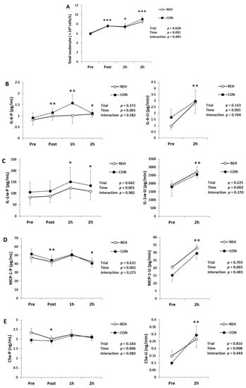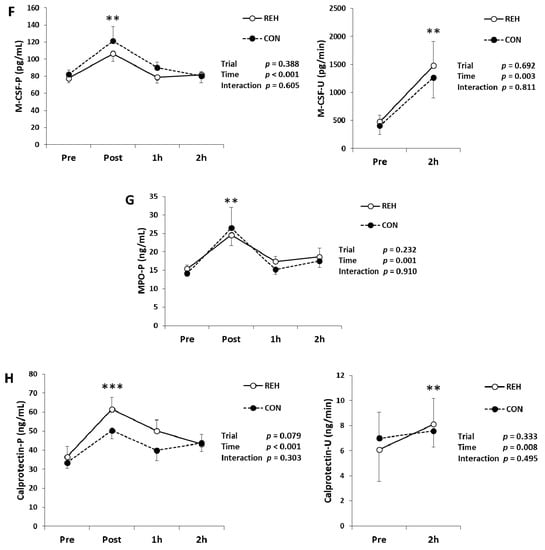 (A) Change in the number of total leukocytes in whole blood. Changes in (B) IL-6, (C) IL-1ra, (D) MCP-1, (E) C5a, (F) M-CSF, (G) MPO and (H) calprotectin in plasma (P) and urine (U). Values are presented as mean ± SE. * p < 0.05, ** p < 0.01, *** p < 0.001 vs. Pre. IL-6, interleukin-6; IL-1ra, interleukin-1 receptor antagonist; MCP-1, monocyte chemoattractant protein 1; C5a, complement 5a; M-CSF, macrophage colony-stimulating factor; MPO, myeloperoxidase; REH, rehydrate trial; CON, control trial.