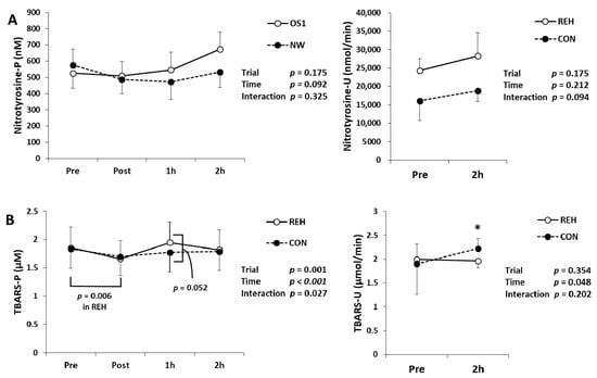 We measured d-ROMs, BAP, uric acid, nitrotyrosine and TBARS in serum, plasma and urine to evaluate oxidative stress and antioxidant substances. Serum d-ROMs and BAP concentrations did not change after exercise (Table 3). Serum uric acid concentration decreased immediately after exercise and increased 1 h and 2 h after exercise (Table 3). Urinary uric acid concentration increased after exercise (Table 3). Plasma and urinary nitrotyrosine concentrations did not change after exercise (Figure 4A). Plasma TBARS concentration showed different changes between trials (interaction; p = 0.027). Immediately after exercise, plasma TBARS concentration in REH decreased compared to Pre. One hour after exercise, plasma TBARS concentration in REH had a higher trend than that in CON (p = 0.052) (Figure 4B). Urinary TBARS and 8-OHdG concentrations increased after exercise (Figure 4B,C). Except for plasma TBARS, the changes of the oxidative stress markers did not differ between trials (interaction; p > 0.05). These results indicate that beverage intake quickly restored oxidative stress concentration in plasma.