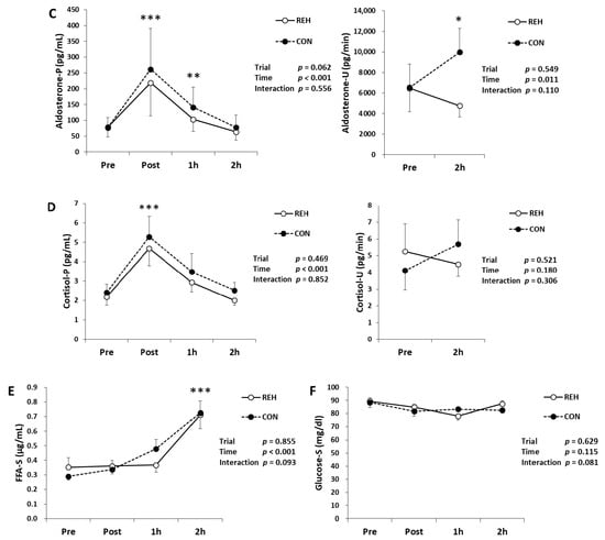 We measured hormones to evaluate the stress response. Plasma growth hormone concentration increased immediately and 1 h after exercise (Figure 5A). Plasma insulin concentration decreased 1 h and 2 h after exercise (Figure 5B). Plasma aldosterone concentration increased immediately after exercise and urinary aldosterone concentration did not change (Figure 5C). Plasma cortisol concentration increased immediately after exercise, whereas urinary cortisol concentration did not change (Figure 5D). Serum FFA concentration increased 2 h after exercise (Figure 5E). Serum glucose concentration did not change after exercise (Figure 5F). The changes in the above parameters did not differ between trials (interaction; p > 0.05). These results indicate that beverage intake did not affect hormonal responses.
