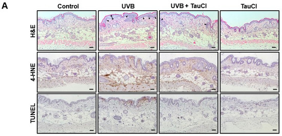 Exposure to UVB irradiation leads to cutaneous inflammation and oxidative stress [6,7,8]. The images of H&E stained epidermal skin sections demonstrated attenuation of the skin hyperplasia and infiltration of inflammatory cells in TauCl-treated mice (Figure 1A). ROS-mediated oxidative stress causes lipid peroxidation and apoptotic DNA fragmentation [22,23]. The accumulation of 4-HNE, the end-product of lipid peroxidation, was abrogated by topical application of TauCl (Figure 1A,B). TauCl treatment also reduced the production of TUNEL-positive apoptotic cells (Figure 1A) and the cleavage of caspase-3, a hallmark of apoptotic cell death, in whole lysates (Figure 1C).