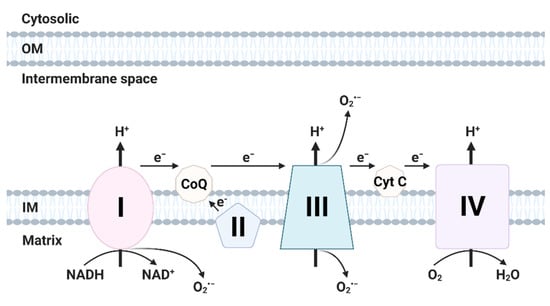 Generation of ROS in electron transport chain (ETC). The ETC is located in the mitochondrial inner membrane (IM). Complex I and II supply electrons to coenzyme Q (CoQ; ubiquinone). Sequentially, electrons are transferred from CoQ to Complex III, cytochrome c (Cyt c) and Complex IV. Oxidative stress is generated during electron transfer. (Created with BioRender.com accessed on 29 March 2021).