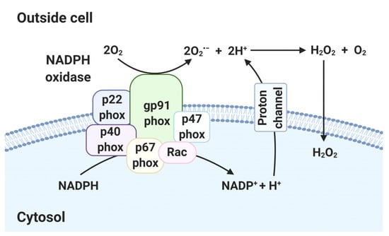 Generation of ROS in NADPH oxidase (NOX). In NOX, electrons of cytoplasmic NADPH are transferred to extracellular oxygen via gp91phox, forming O2•−. Other subunits (p22phox, p40phox, p47phox, p67phox and Rac) are responsible for NOX stabilization and regulation. The proton channel transfers protons extracellularly. O2•− is converted to H2O2 and diffuses through lipid membranes into the intracellular space. (Created with BioRender.com accessed on 29 March 2021).