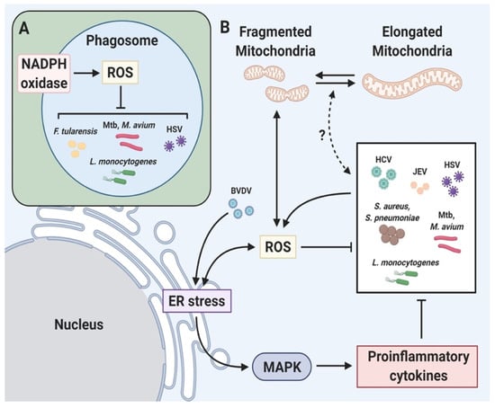 Relationship between ROS and pathogens. Pathogen elimination via ROS-mediated immune signaling. (A) Pathogens are recognized by PRRs, phagocytized and digested. NOX is assembled and activated to produce ROS in the phagosomal membrane, resulting in elimination of the pathogen. (B) ER stress and mitochondrial fragmentation induce ROS production. ROS-induced ER stress boosts proinflammatory cytokine production via MAPK, resulting in microbial killing. Illustration of pathogen-mediated regulation of immune signaling via ROS production. HCV, hepatitis C virus; JEV, Japanese encephalitis virus; HSV, herpes simplex virus 1; BVDV, bovine viral diarrhea virus; S, aureus, Staphylococcus aureus; S. pneumoniae Streptococcus pneumoniae; M. tuberculosis, Mycobacterium tuberculosis; M. avium, Mycobacterium avium; L. monocytogenes, Listeria monocytogenes; F. tularensis, Francisella tularensis. (Created with BioRender.com accessed on 29 March 2021).