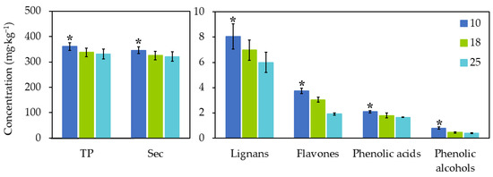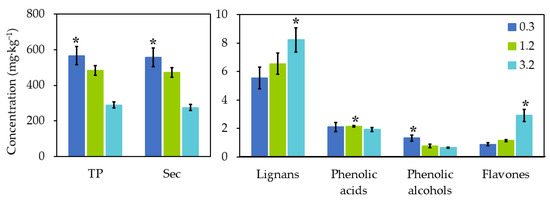 | Lignans | 5.57 ± 0.76 b | 6.56 ± 0.75 b | 8.24 ± 0.85 a |