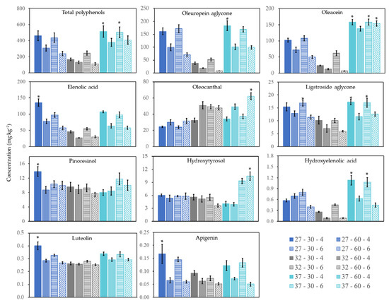 - Lukić, I.; Žanetić, M.; Jukić Špika, M.; Lukić, M.; Koprivnjak, O.; Brkić Bubola, K. Complex interactive effects of ripening degree, malaxation duration and temperature on Oblica cv. virgin olive oil phenols, volatiles and sensory quality. Food Chem. 2017, 232, 610–620. [Google Scholar] [CrossRef]