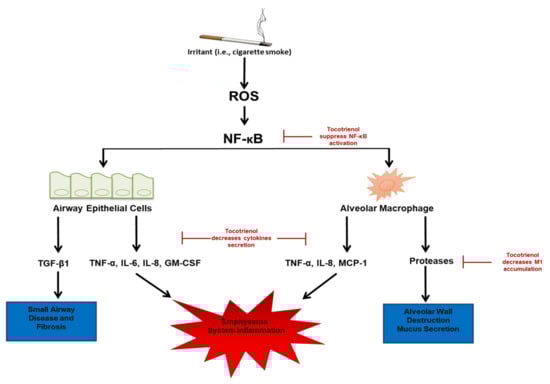 The effects of tocotrienols on the pathogenesis of COPD. Environmental irritants, such as cigarette smoke, produce ROS that activates NFκB, a major inflammation regulator. NFκB, in turn, stimulates the production of pro-inflammatory cytokines including TGF-β1, TNF-α, IL-6, IL-8, and GM-CSF in airway epithelial cells and TNF-α, IL-8, MCP-1, and proteases in alveolar macrophages. Collectively, these pro-inflammatory molecules lead to small airway disease and fibrosis, alveolar wall destruction, mucus secretion, emphysema, and systemic inflammation. Tocotrienols suppress NFκB activation, decrease cytokine secretion and M1 accumulation, and consequently attenuate the inflammatory response induced by the irritants.
