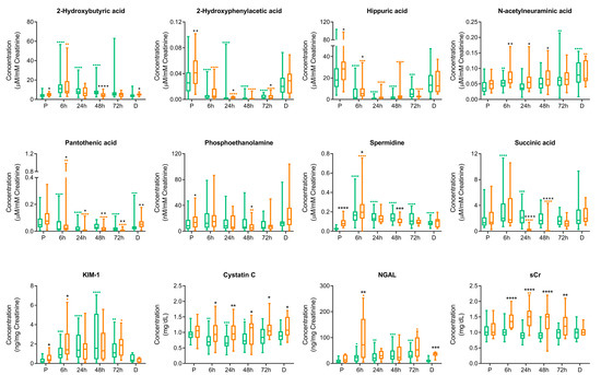 Concentration values variation over time of molecular features identified in association with post-surgery AKI. Comparison of levels between CVS-C and CVS-AKI subjects is represented in boxplot (min–max) at each point of time (pre-surgery: P; post-surgery: 6, 24, 48, 72 h and discharge (D)). Concentration levels over time of CVS-C subjects are shown in green and levels in CVS-AKI subjects are shown in orange. Mann–Whitney statistical test was performed to compare clinical groups at each timepoint (CVS-C vs. CVS-AKI): * p < 0.05, ** p < 0.01, *** p < 0.001, **** p < 0.0001 (significance in black). The Kruskal–Wallis statistical test was performed to identify significant variations between post-surgery points of time (6, 24, 48, 72 h or D) and pre-surgery levels (P): • p < 0.05, •• p < 0.01, ••• p < 0.001, •••• p < 0.0001 (significance in green for CVS-C values and in orange for CVS-AKI values).