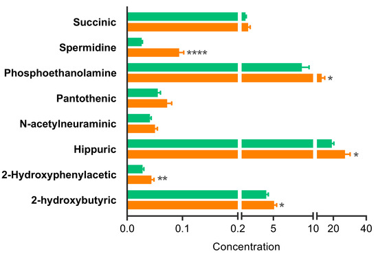 Differential analysis of metabolite concentrations in pre-surgery urine samples. Concentration values are expressed in uM/mM Creatinine for all metabolites except phosphoethanolamine, for which the concentration value is expressed in nM/mMCreatinine. Green bars: CVS-C; Orange bars: CVS-AKI. Mann–Whitney: * p < 0.05, ** p < 0.01, **** p < 0.0001.