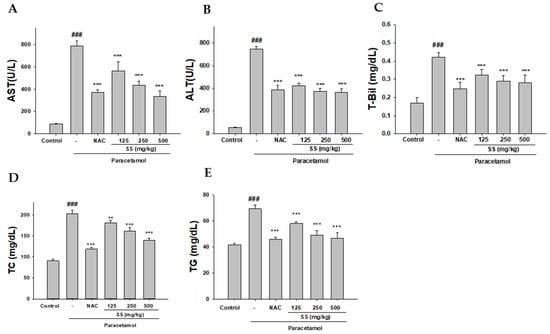 Effects of S. sanghuang mycelium (SS) on paracetamol-induced increase in serum AST (A), ALT (B), T-Bil (C), TC (D), and TG (E) levels. SS was orally administered to mice for 6 days, with the last dose 1 h before paracetamol administration. The values are reported as the means ± S.E.M. (n = 6). ### p < 0.01 relative to control; ** p < 0.01 and *** p < 0.001 relative to the paracetamol group.