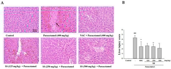 Effects of SS on histological alterations and the severity of liver injury in the liver after paracetamol overdose. Tissue sections were then stained with H&E (400x) (A) and the living injury score (B) and evaluated under a microscope. The data are presented as the means ± S.E.M (n = 6). ### p < 0.01 relative to the control group. ** p < 0.01 relative to the paracetamol group. Arrowheads denote central veins and highlight liver injury/necrosis.