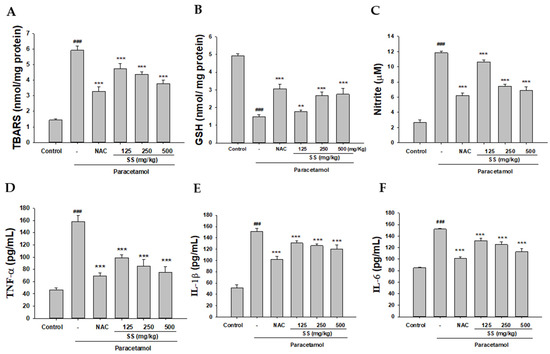 Pretreatment with SS decreased lipid peroxides (A), increased GSH (B) levels, and reduced levels of inflammatory cytokines NO (C), TNF-α (D), IL-1β (E), and IL-6 (F) in paracetamol-treated mice. SS was orally administered to mice for 6 days, with the last dose 1 h before paracetamol administration. GSH was determined and expressed as μmol/g liver tissue. Nitrite concentration in the serum was determined using Griess reagent. Serum concentrations of TNF-α, IL-1β, and IL-6 were determined using commercial ELISA kits. The values are reported as the means ± S.E.M. (n = 6) of five mice per group. ### p < 0.01 relative to the control group. ** p < 0.01 and *** p < 0.001 relative to the paracetamol group.