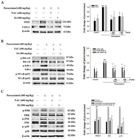 Effects of SS treatment on hepatic iNOS, COX-2 (A), IKK, IκBα, NF-κB (B), and MAPK (C) expression in paracetamol-induced liver injury. Total protein was extracted from liver tissues. The protein expression levels were determined by Western blotting. The bands’ intensities were quantified and normalized as per those for β-actin. The values are reported as the means ± S.E.M. of five mice per group. ## p < 0.01, ### p < 0.01 relative to the control group; ** p < 0.01, and *** p < 0.001 relative to the paracetamol group.