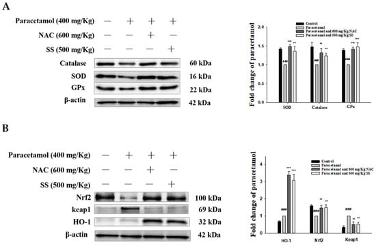 SS upregulated antioxidant enzymes (catalase, SOD, and GPx) (A) and activated protective mechanisms via Keap1/Nrf2/HO-1 signaling pathway (B) after paracetamol challenge. Total protein was extracted from liver tissues. The protein expression levels were determined by Western blotting. The bands’ intensities were quantified and normalized to those for β-actin. The values are reported as the means ± S.E.M. of five mice per group. ### p < 0.01 relative to the control group; ** p < 0.01 and *** p < 0.001 relative to the paracetamol group.